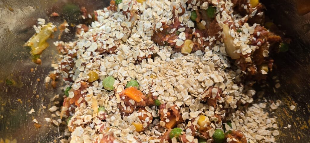 Rolled oats and chickpea flour add soluble fibre that promotes gut health and fullness, while beef delivers complete protein for muscle repair and energy.