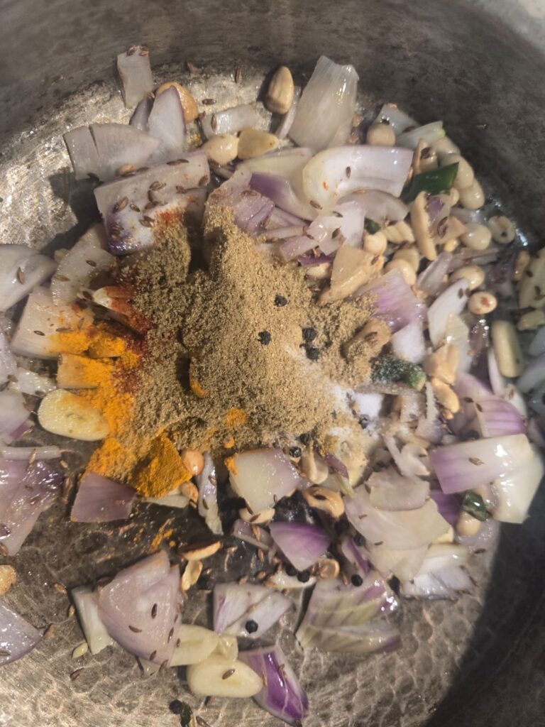 In the same pan, add garlic, green chilli, 3/4 Onion, turmeric, coriander powder, paprika, black pepper, and salt. Sauté for 5–6 minutes until the mixture thickens and oil starts to separate slightly.