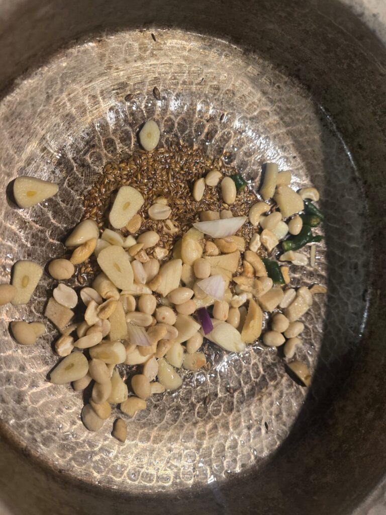 Heat ½ tsp ghee or olive oil in a pan. Add cashew-peanut mix and cumin seeds. Toast gently until golden and fragrant. Remove and set aside.